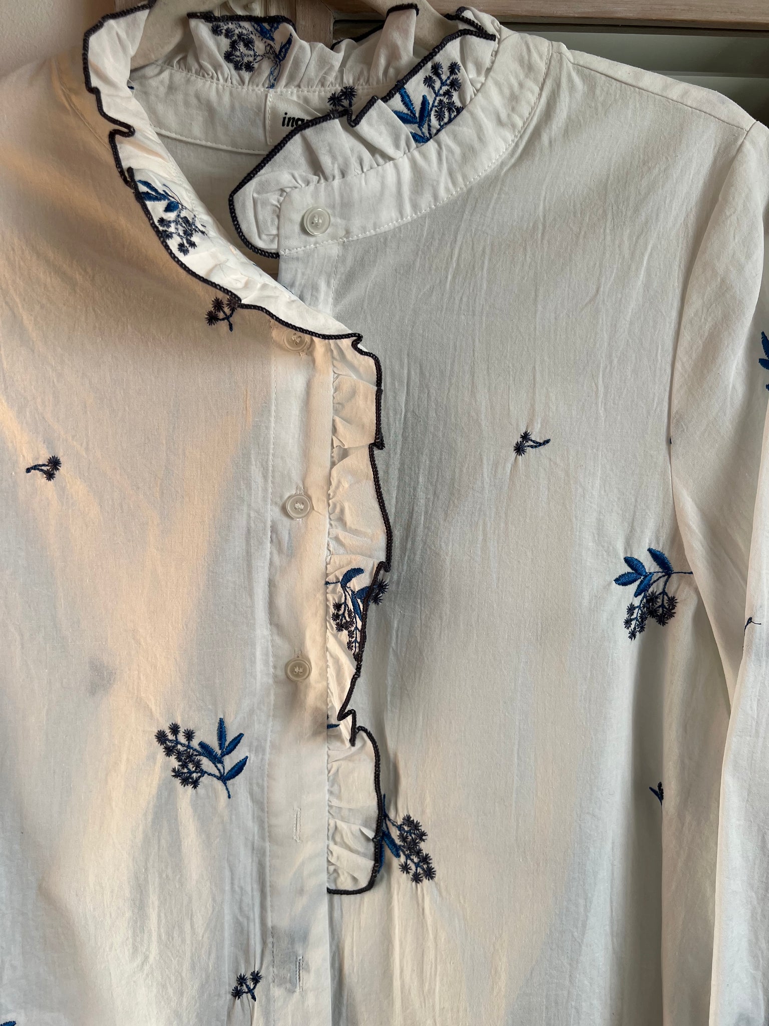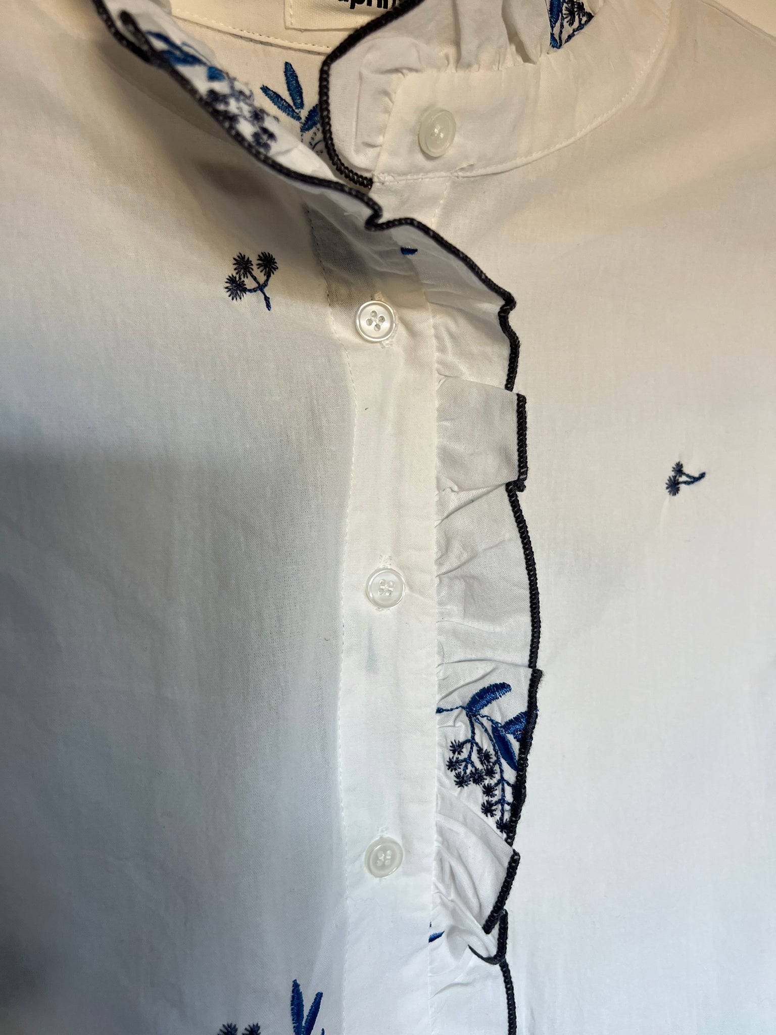 Gorgeous Cotton blouse with beautiful detailing. Embroidered florals and frill make this a really feminine piece. Perfect to style with jeans or smarten up with workwear. This has all the feels of Sezane style.
