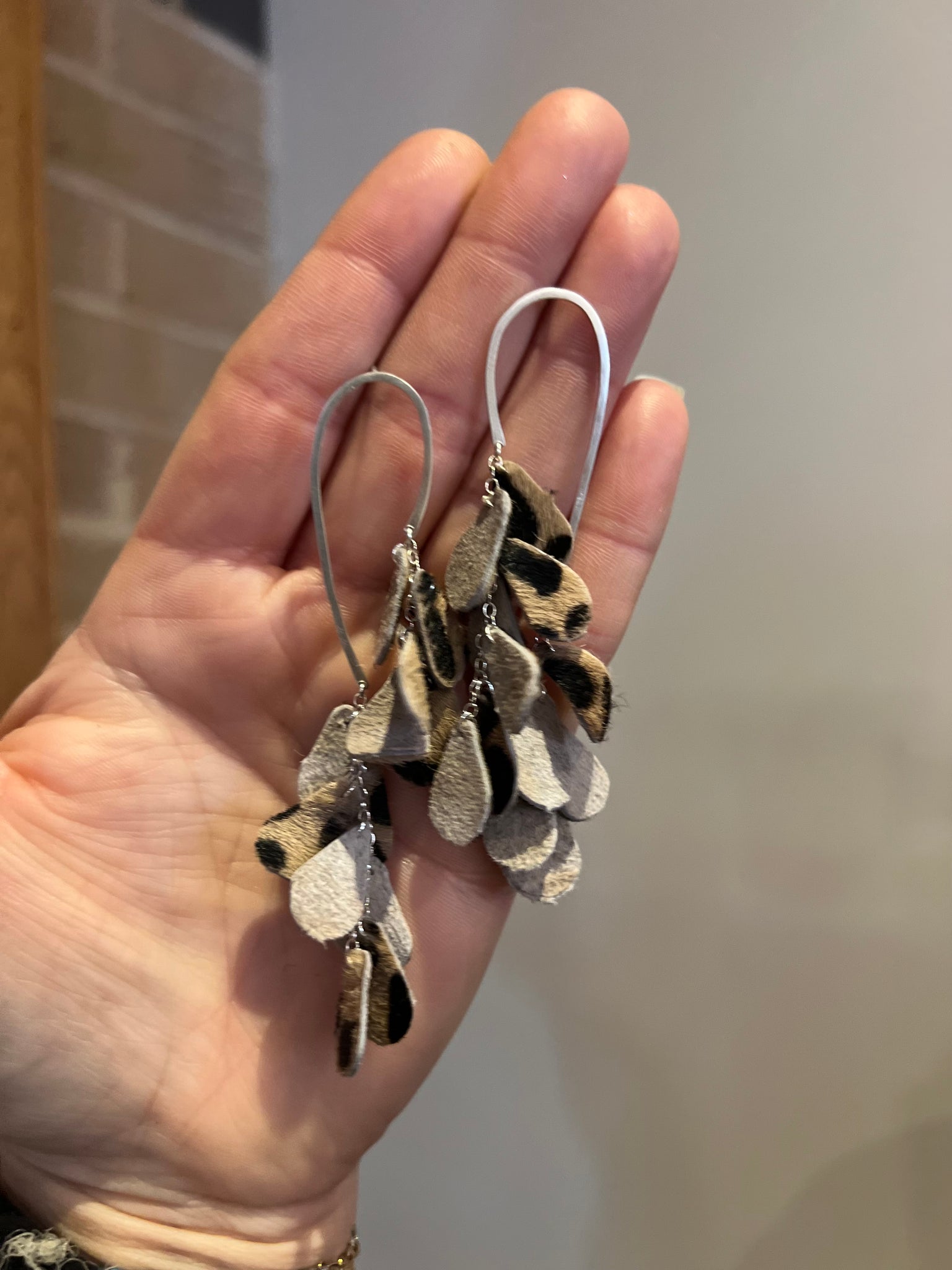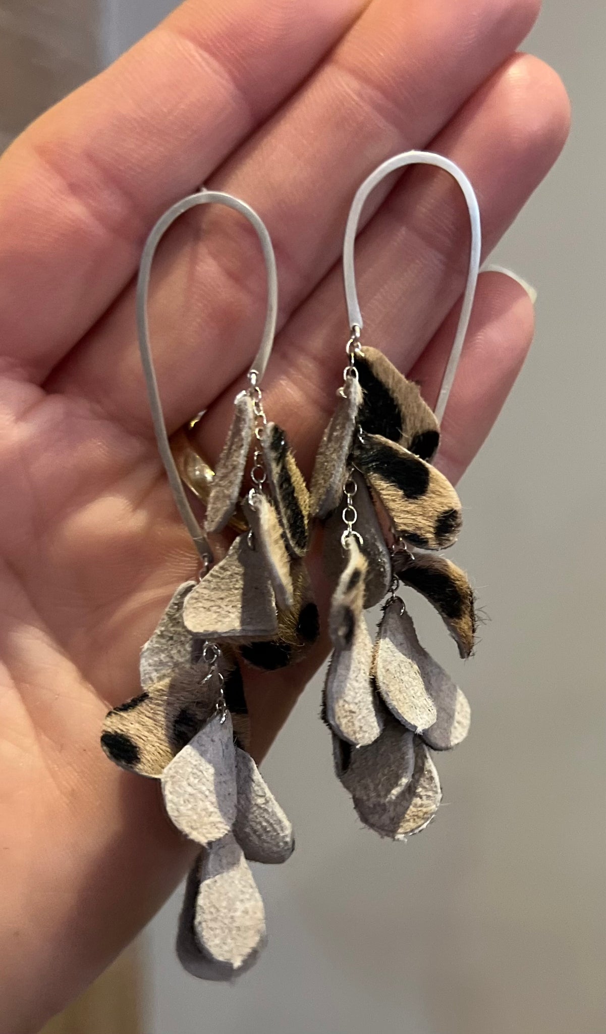 Handmade Silver drop earrings with hand-cut leather teardrops.