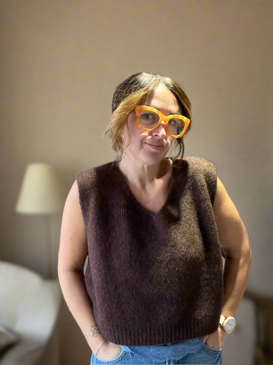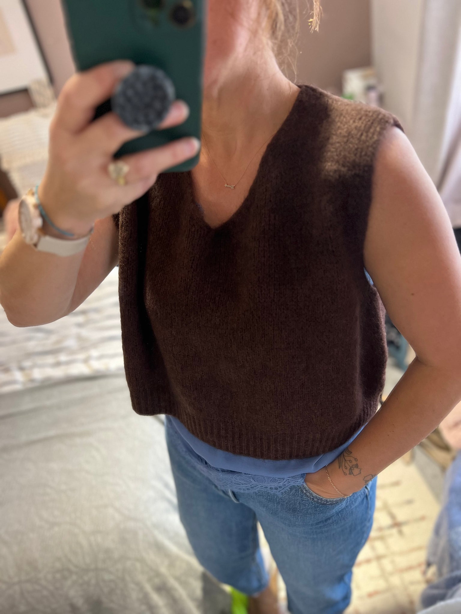 Soft feel Mohair knitted vest, perfect for layering over shirts or dresses or as it is on it's own or under a cardy. The perfect shade of Chocolate to pair with denim.