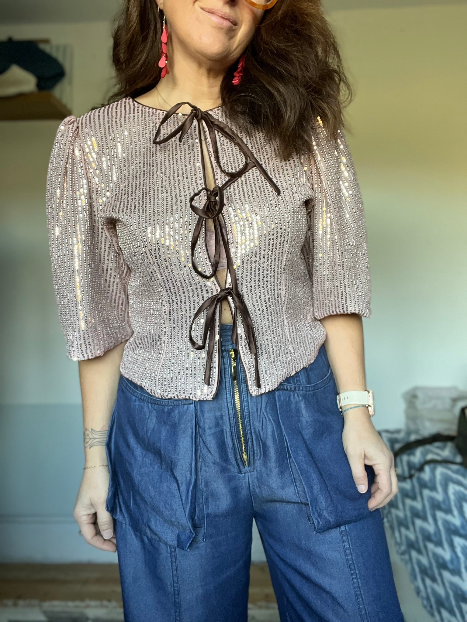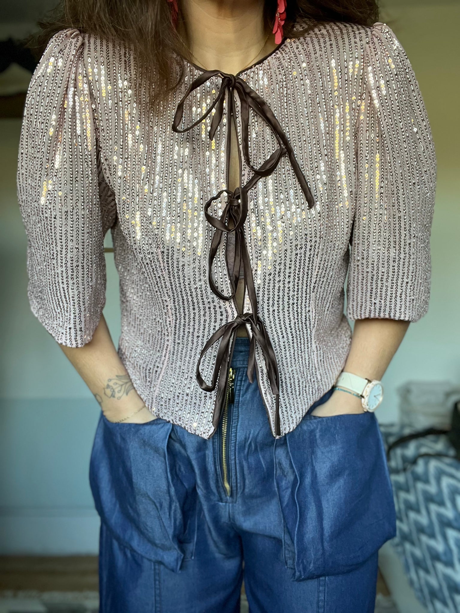 Jo’s Style Tip…Sparkle that last beyond the Festive Season. This gorgeous top in rose lined in dark chocolate satin is a little piece of luxury you can wear year-round. Simple classics last forever. The satin tie fastenings can be worn front or back and it can be styled as a little jacket too.