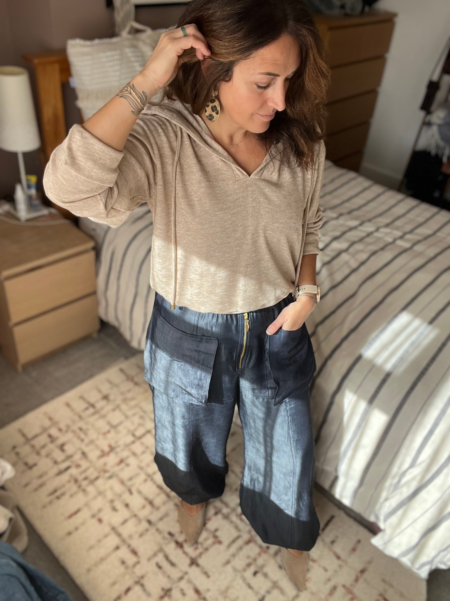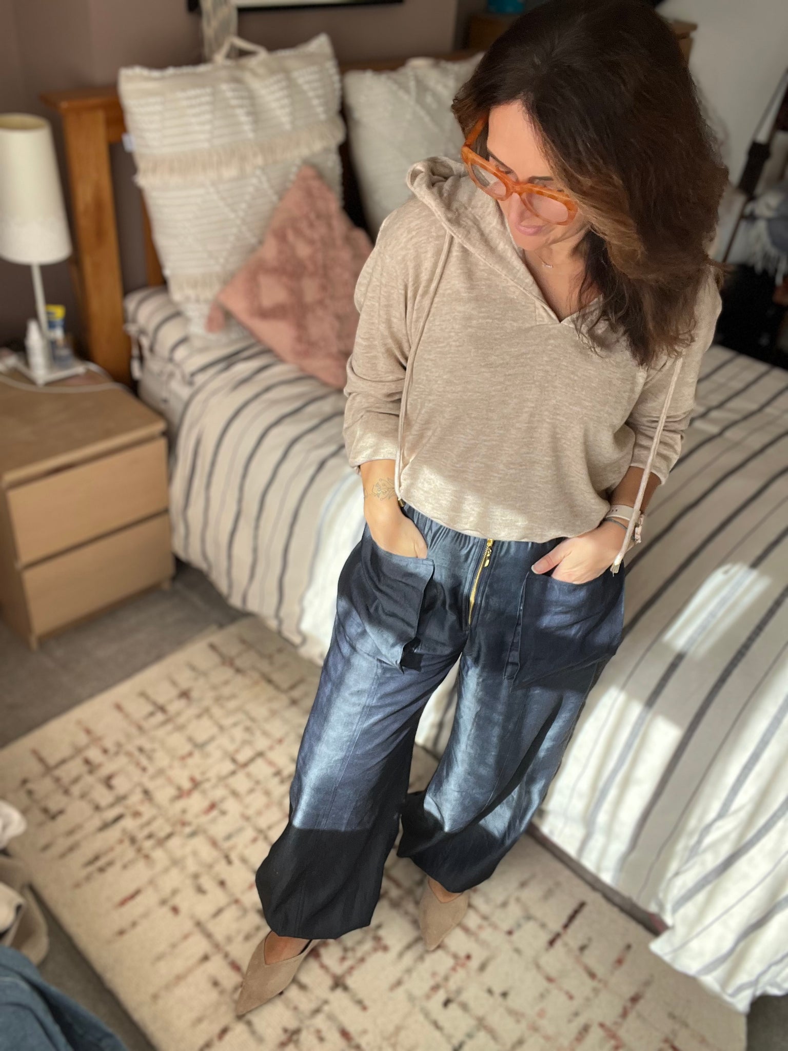 JO's STYLE TIP...You know I'm all about elevated style with minimum effort! haha well it's just easy right? So this hoodie is a step up from wearing your hubby's. Soft cashmere feel, neutral colour, slouchy fit but with just a little bit of grown up sexy with a v-neck to show those gorgeous collar bones off. The cuffs are long to keep your hands warm on those Sunday walks (or work from home days) but can be folded back when you're styling under your trench coat. No need to tuck in either as you can use the ribbed waistband instead.